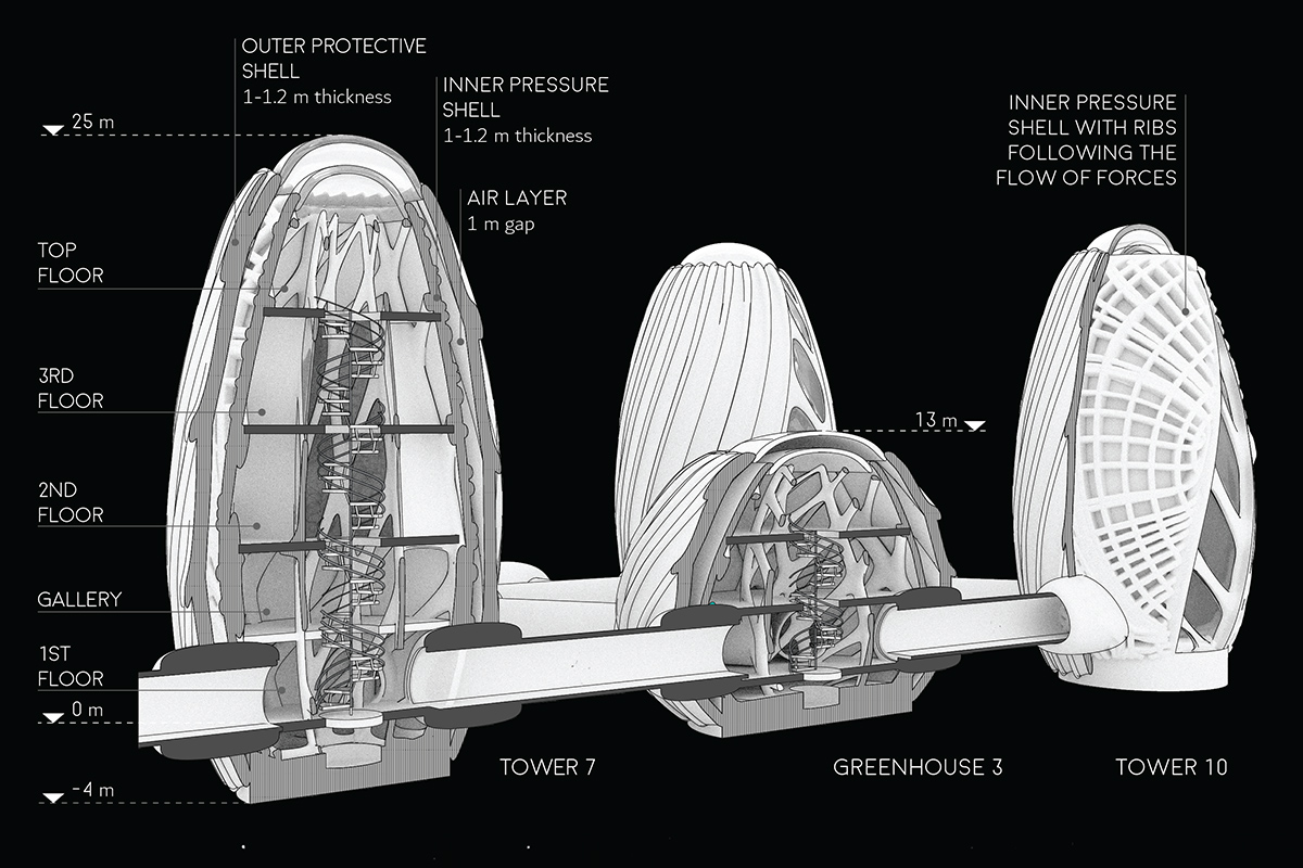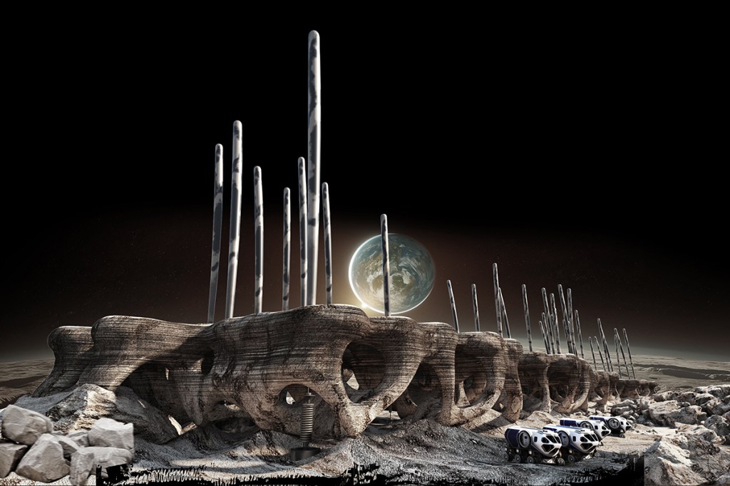 Their futuristic hub design showcased built-in greenhouses, recycling management stations, oxygen regeneration stations and residential towers for lunar settlers.