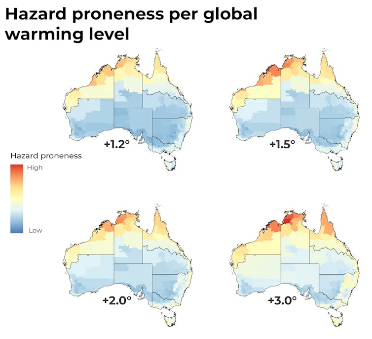 Maps showing Northern Australia is highly prone to hazards, even under modest future global heating.