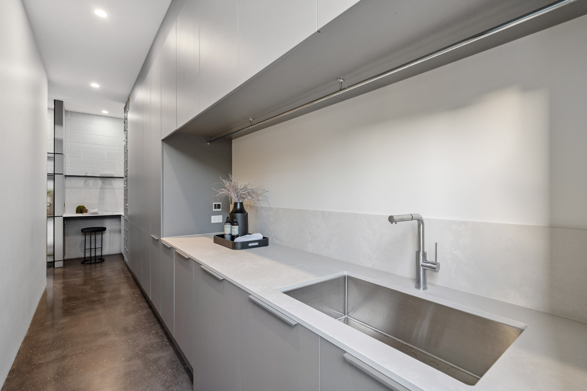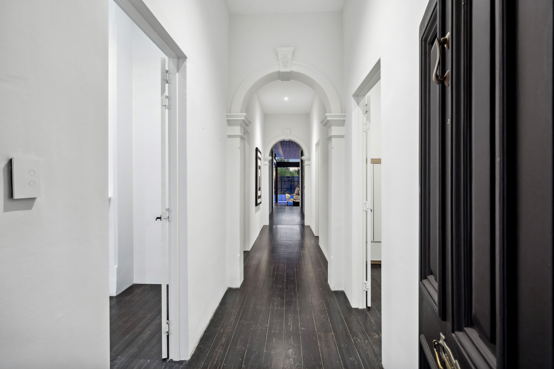The hallway to the rear of the house leads to the modern addition with an expansive open-plan living dining and kitchen area, as well as a large pantry and a study nook.