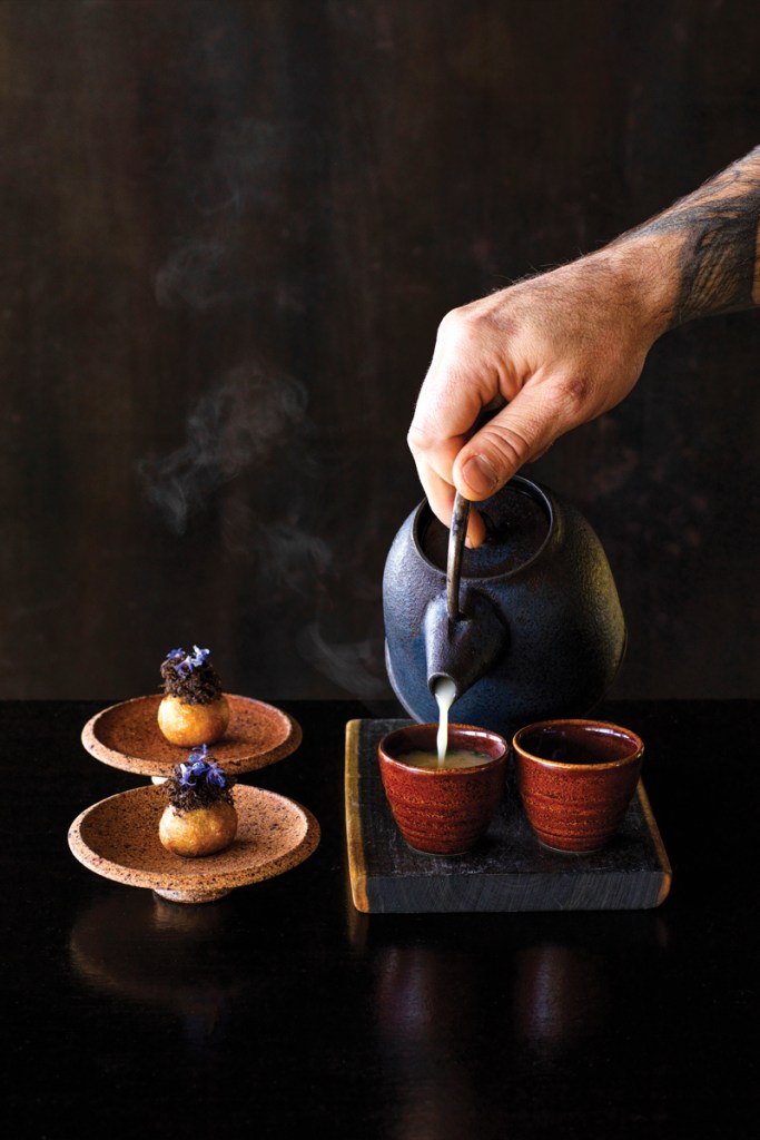 That chill is felt in the dining room, the wintry rain setting in now. Things take a moment to settle: an incorrect drink poured at the table causing confusion and delay with our own drinks ordering. Before we know it, the degustation begins with a steady stream of bite-sized “snacks”, which demonstrate the passion and technique of Huggins and his team. There’s a bit of fun, a bit of foam, and a healthy dose of smoke.