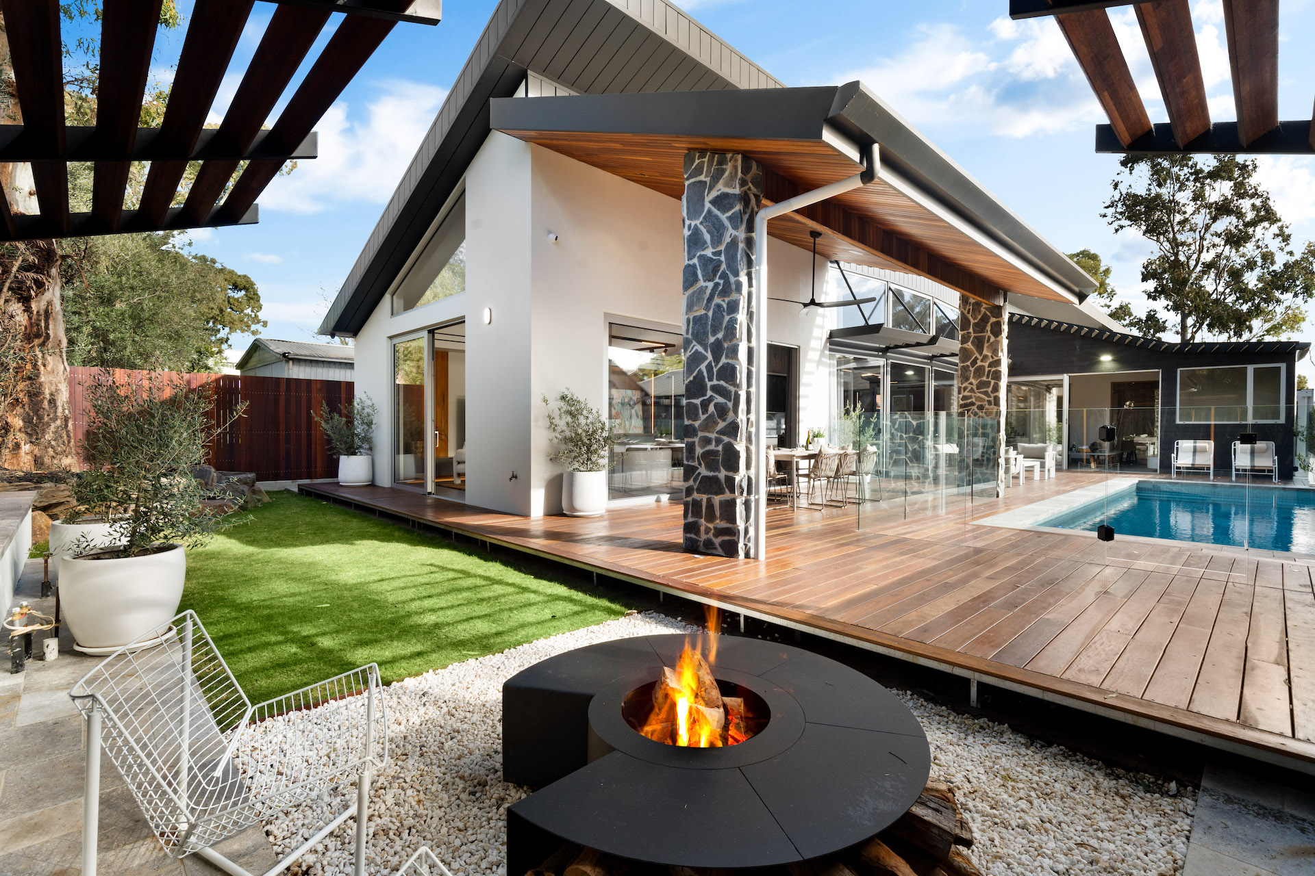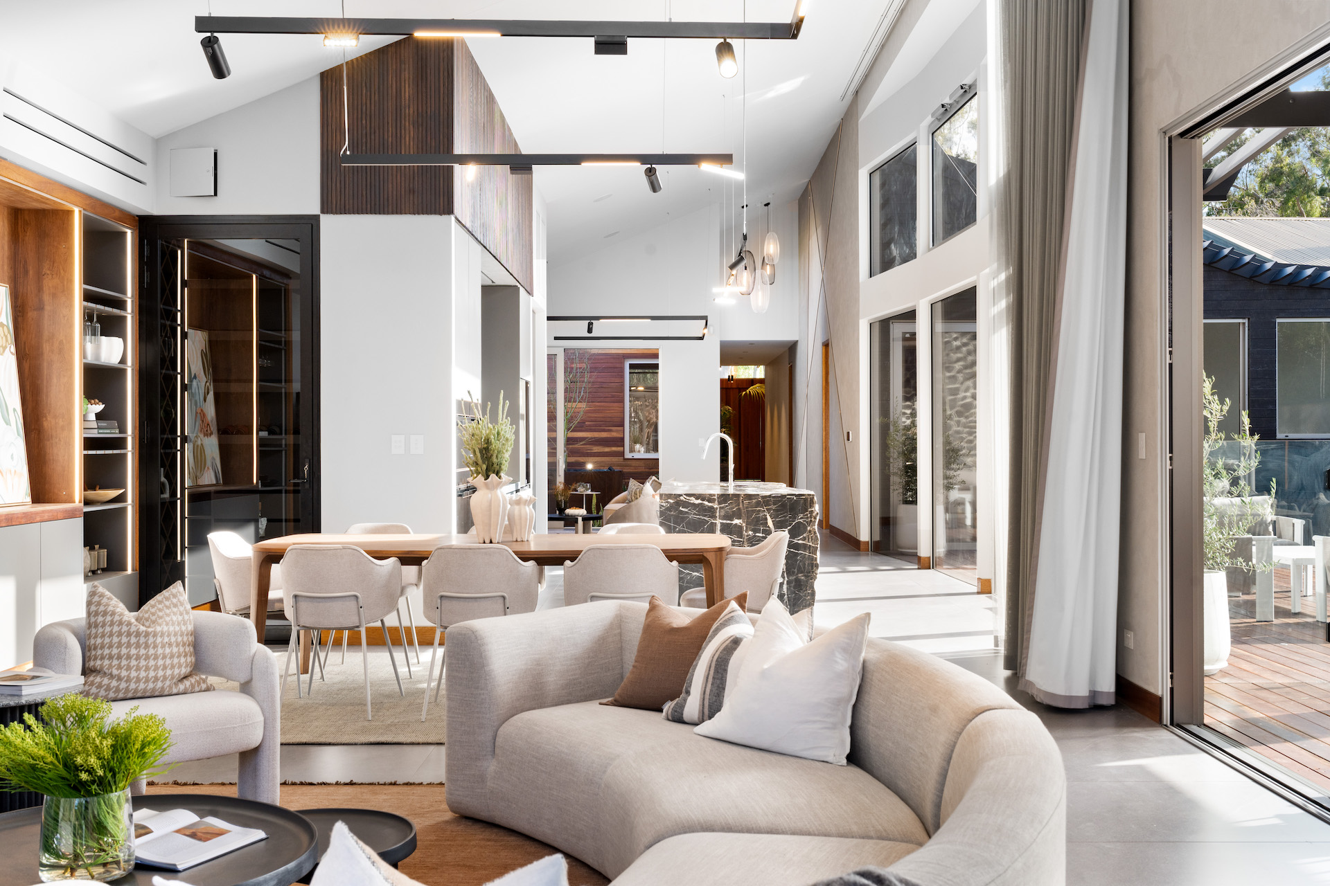 Built from 2023 to ’25, the contemporary dwelling sits on a 900 square metre block and includes five bathrooms, four bathrooms and space for up to six cars.
