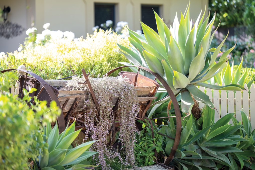 The garden, which is situated entirely in front of the house, is laid out into four garden rooms. There’s a garden directly in front of the home, a sweeping horseshoe driveway and expanse of lawn, and gardens to the left and right. Many plants have been chosen for their ability to tolerate the Riverland’s hot and dry summers.
