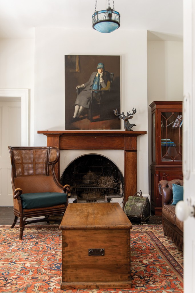 Margaret says her style is all about finding things she loves and then “plonking” them wherever they might go – which sometimes leads to a bit of trial and error. In the library, a portrait purchased at Scammells Auctions painted by former Art Gallery of South Australia director Leslie Wilkie, which Margaret believes is of Wilkie’s daughter, hangs above an old fireplace.