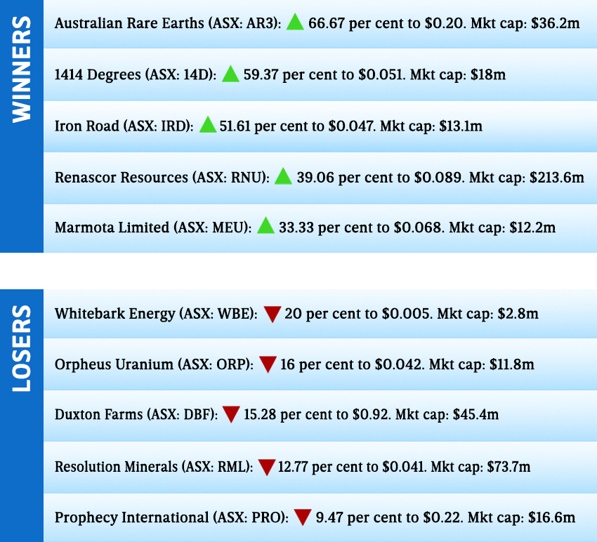 The top Winner was Australian Rare Earths, which rose 66.67 per cent in the five days. Power Minerals was just short of the top five but posted a gain after it said it was acquiring a high-grade rare earth/uranium project in California.